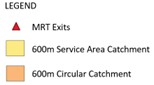 The catchment area is divided into an inner and an outer ring. The inner ring catchment area is defined by the 600 meters walking distance from the station exits/entries, using the service area approach. The outer ring catchment area is a Circular Buffer consisting of 600-meter flying distance from the station. It uses the Euclidean distance and circular approach which does not take account of natural barriers like trees, buildings, lakes, etc. Despite its drawbacks, it is useful for the overall analyses of the catchment areas.